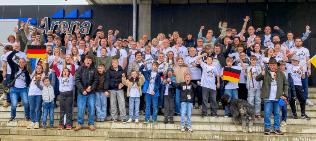Japaner mit 9:1 von der Fläche. Es ist schon etwas Besonderes vor heimischen Publikum eine WM zu spielen. Der Großteil der ca. viertausend Zuschauer war natürlich auf der Seite der Deutschen und feuerten unsere Jungs frenetisch an. Die Sieger der beiden Vorrundengruppen haben sich direkt für die Final 4 qualifiziert. Das waren wir und die Mannschaft aus der Schweiz. Der zweite und dritte beider Gruppen spielten über Kreuz um den Einzug in die Final 4. Österreich und Frankreich waren die Sieger dieser Kreuzspiele. Die besten 4 spielten noch einmal jeder gegen jeden. Davon war das erste Spiel der Deutschen Mannschaft noch am Samstag Abend, gegen die Schweiz. Sowohl die Schweizer wie auch die Deutschen Fans rollten vor jedem Spiel ihrer Mannschaften ein großes Banner auf den Tribünen aus und unterstützten damit ihre Mannschaften. Danke Iris für diese gute dee. Die Schweizer Gebrüder Fröhlich konnten unseren Jungs an diesem Tag nicht viel entgegen setzen und verloren mit 1:4 Toren. Das erste Spiel am Sonntag fand dann wieder gegen Frankreich statt und wie schon am Freitag gewannen Rapha und Bernd mit 5:1 Toren. Dann kam es zum ersten Aufeinandertreffen zwischen Österreich und Deutschland. Derzeit die beiden besten Mannschaften der Welt, zwischen denen es immer knapp zugeht. Es sind immer herrvorragende Spiele die von beiden Seiten offen und schnell gespielt werden. Wahrlich eine Werbung für unseren geilen Sport. Beide hatten bis zu diesem Zeitpunkt kein Spiel verloren und waren schon sicher im Finale. Aber in diesen Aufeinandertreffen geht es auch ums